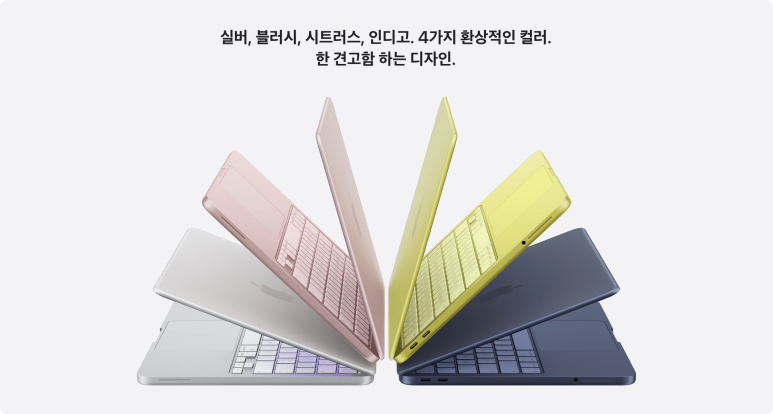 제품 색상은 총 4가지로 출시가 되었네요. 실버, 블러시, 시트러스 그리고 인디고 요렇게 4가지 중에서 선택하시면 됩니다. 실버랑 인디고는 익숙한 느낌인데, 블러시랑 시트러스가 눈에 띕니다. 이번 맥북 네오 기기의 대표 컬러는 뭘까요? 블러시? 시트러스? 공홈 소개 페이지 모델의 시트러스 색상이 대표 컬러이지 싶습니다.
