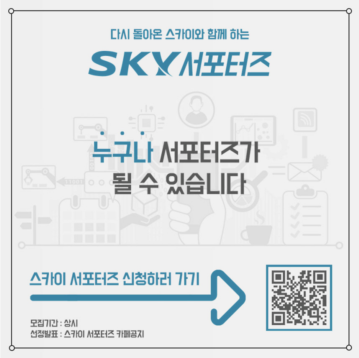 아!~!! 그리고 추가로 안내 말씀 하나 드릴게요. 혹시 블로그를 운영하시면서 스카이 브랜드 제품에 관심이 가는 분들은 아래 스카이 서포터즈 카페에 들러서 내용 살펴보시고 체험단 신청하시면 좋은 인연을 만날 수 있는 기회를 얻을 수 있습니다. 지금 바로 달려가 보세요.