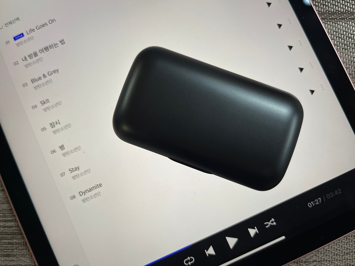 바로 페어링이 되는 겁니다. 요거 신기하네요. 기존 사용자 경험과 조금 달라서 재밌기도 하고요. 케이스 뚜껑을 열면 이전에 연결된 기기에 자동으로 페어링이 되고 이어폰을 꺼내서 음악을 들어봅니다. 오늘 낮에 가족들과 드라이브하면서 새로 나온 BTS 앨범을 들었기에 조용히 요걸로 시작해 봅니다.