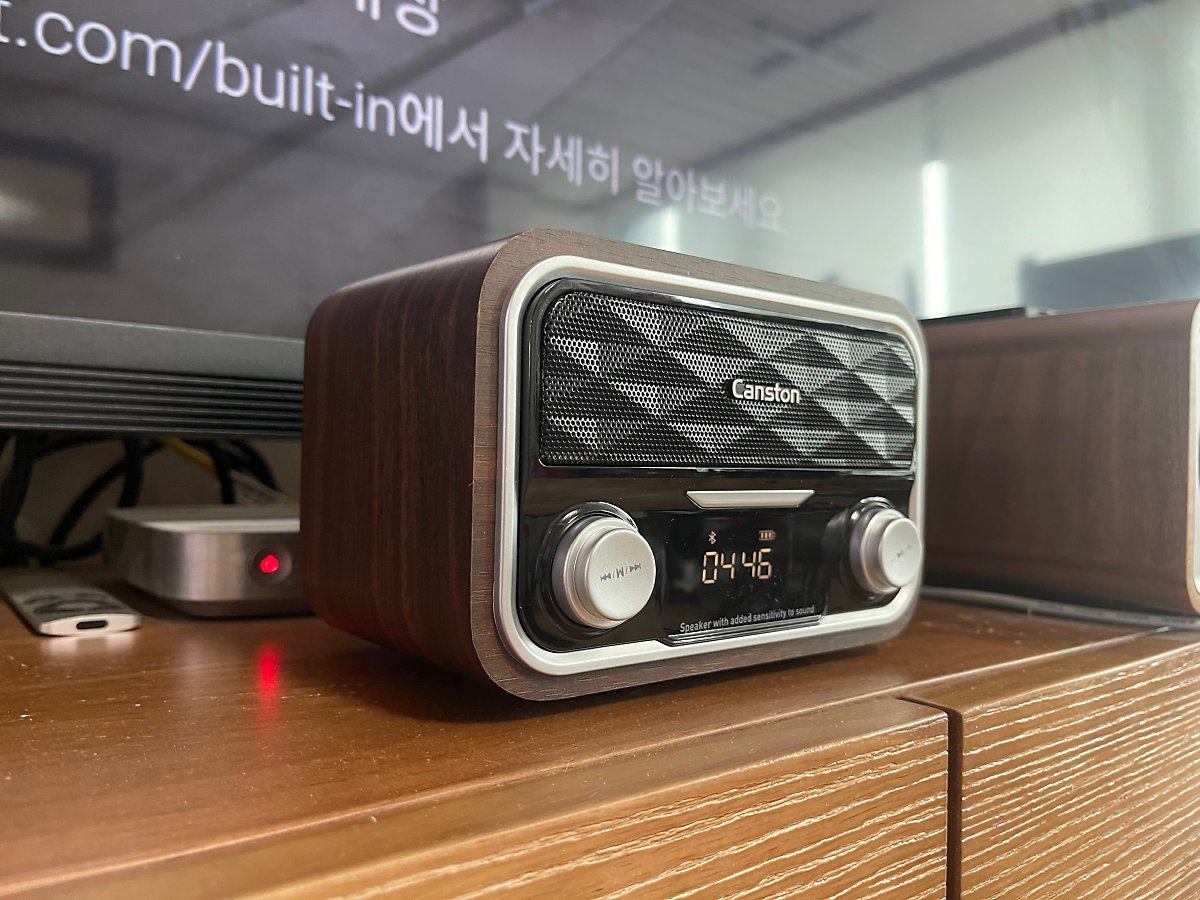 지난 스피커 제품은 전면에 디스플레이 영역 가득히 정보를 전달하는 디자인이었는데... 이번에는 다이얼 방식으로 레트로한 느낌도 강조하고 시계와 함께 라디오 기능까지 갖추고 있는 블루투스 스피커네요. 거기다가 캔스톤 제품에 대한 신뢰도를 높이기 위한 정품 스티커까지...