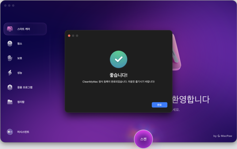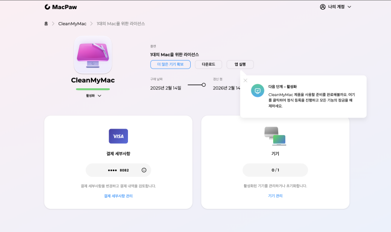 활성화 버튼을 누르면, 방금 설치한 클린마이맥 앱을 실행하게 될 것이고,