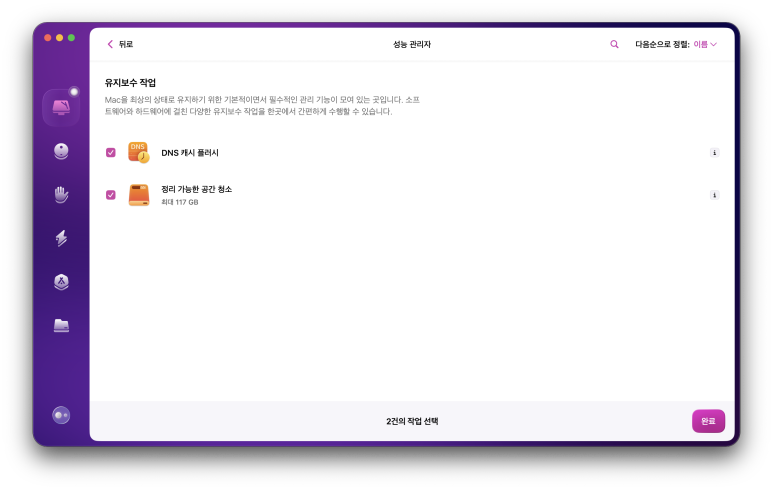 왼쪽 메뉴 내비게이션을 따라서 하나씩 눌러보시면, 방금 수행하였던 각각의 관리 작업을 좀 더 자세하게 실행하고 결과를 확인하실 수 있습니다. 그리고 왼쪽 메뉴에서 제일 하단에 있는 것은 어시스턴트라고 하는 기능으로 현재 기기의 상태와 함께 추천하는 작업들을 나열해 줍니다. 하나씩 보고 적용 여부를 판단하시면 되겠습니다.