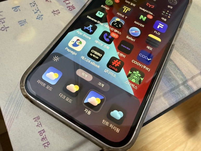 안녕하세요. 워크앳로터스입니다.새로운 기능으로 아이폰 앱 아이콘에도 다크/라이트 모드 설정이 가능하다는건 들어서 알고 있었는데... 쓸 일이 있겠어? 하는 심정으로 그냥 지나쳤나 봅니다. 어느 날 장여사 아이폰 13에 iOS 업데이트 및 몇 가지 확인할 사항이 있어서 살펴보는데... 뭔가 평상시와는 다른 느낌입니다. 밤이라서 다크 모드로 변경이 되어서 그런가? 싶다가도, 뭔가 좀 부자연스러운 평상시 보던 화면의 그 느낌이 아닌 거 같습니다.평상시 제가 알고 있던 아이폰 홈 화면에 대한 다크 모드는 아래와 같이 설정하는 방법을 알고 있습니다. 라이트 모드, 다크 모드 선택이 가능하고 일몰/일출에 따라 자동으로 전환되도록 설정도 가능하고... 이 부분은 이미 아이폰을 사용하는 많은 분들이 알고 사용하고 계실..